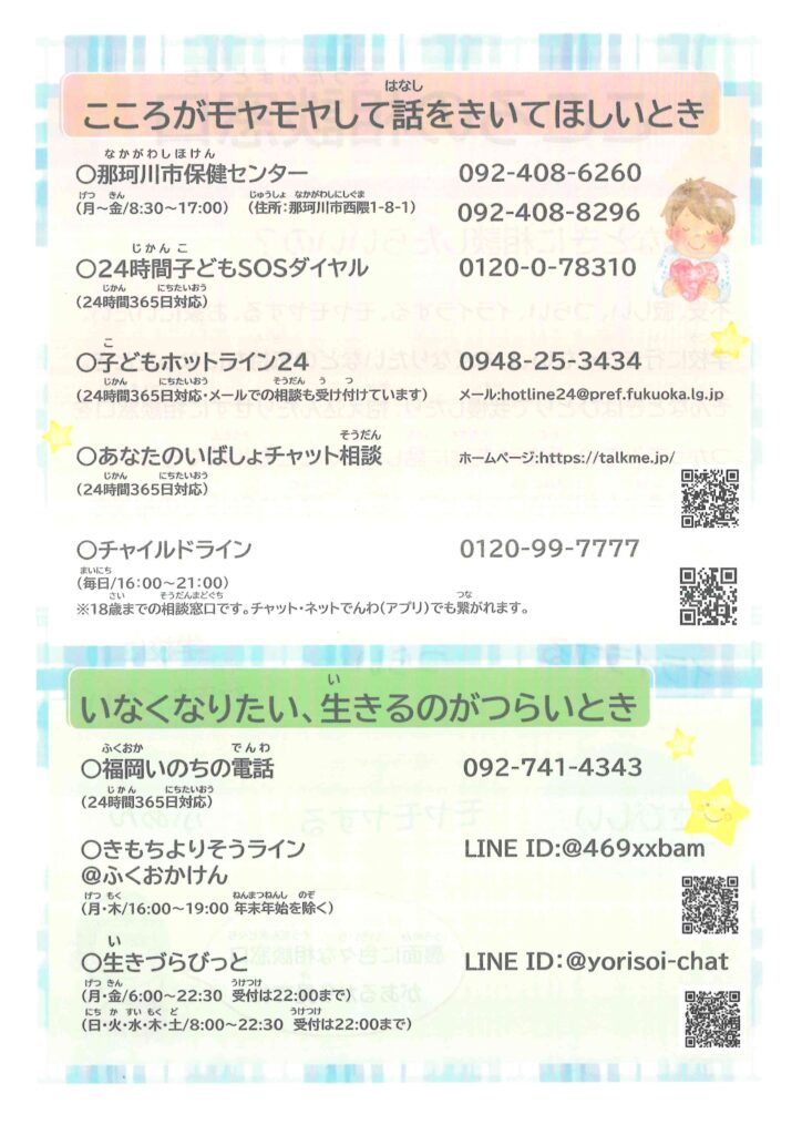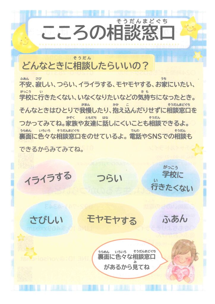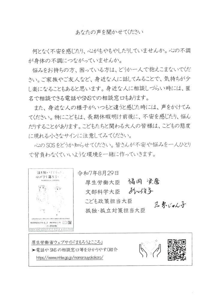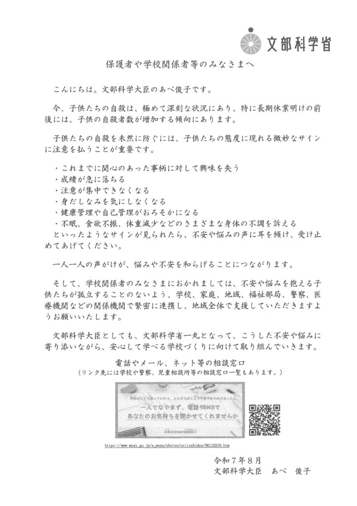 子どもたちの命・心を守るための取組についてお知らせいたします。ご一読ください。
