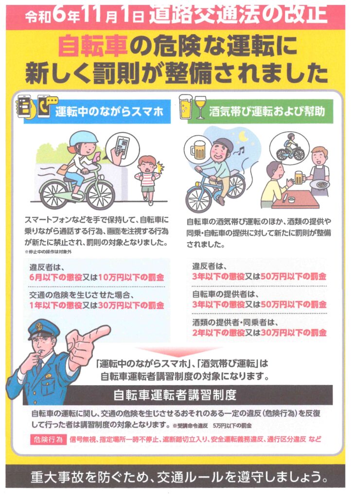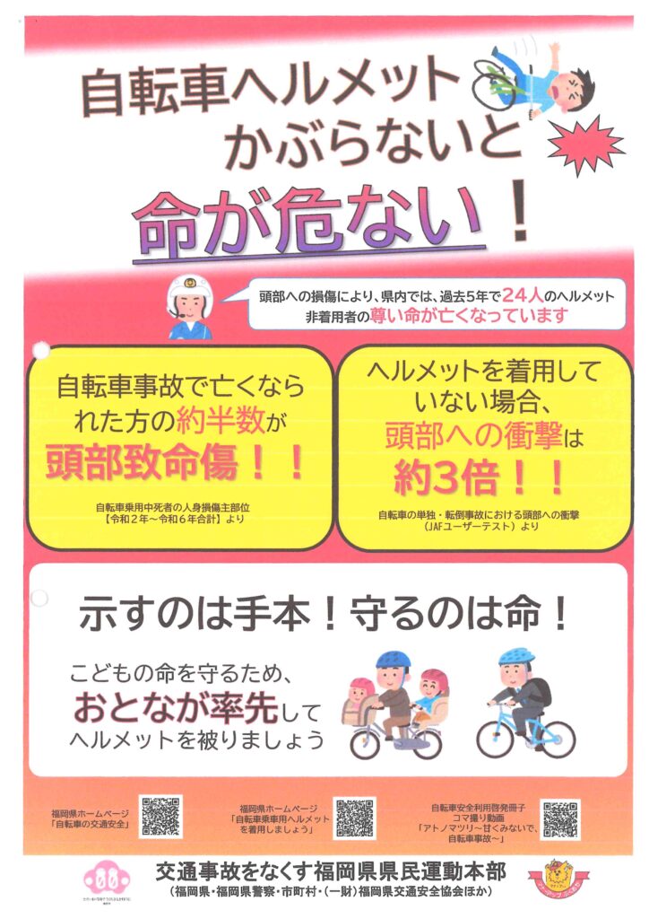 令和6年11月の道路交通法の改正により、自転車の危険な運転への罰則が厳しくなりました。安全のため、自転車に乗るときはヘルメットをかぶりましょう。ヘルメットの着用は努力義務ですが、大切な命を守るために、保護者もお子さんも意識して取り組みましょう。